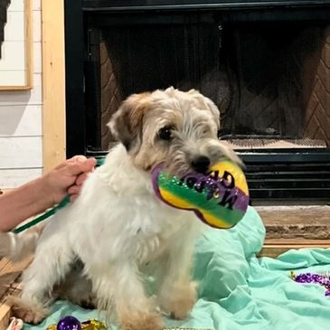 Foxie is a rough coated tan and white girl Russell Terrier . She loves to cuddle and hang out on the bed or in your chair. Foxie is very good at tracking what her people are doing and is instantly there if you happen to have any food, sense she is sure that you wanted to share with her. If she finds a toy it immediately becomes hers and she joyfully takes it off to play with, or maybe just to cuddle while taking a nap.